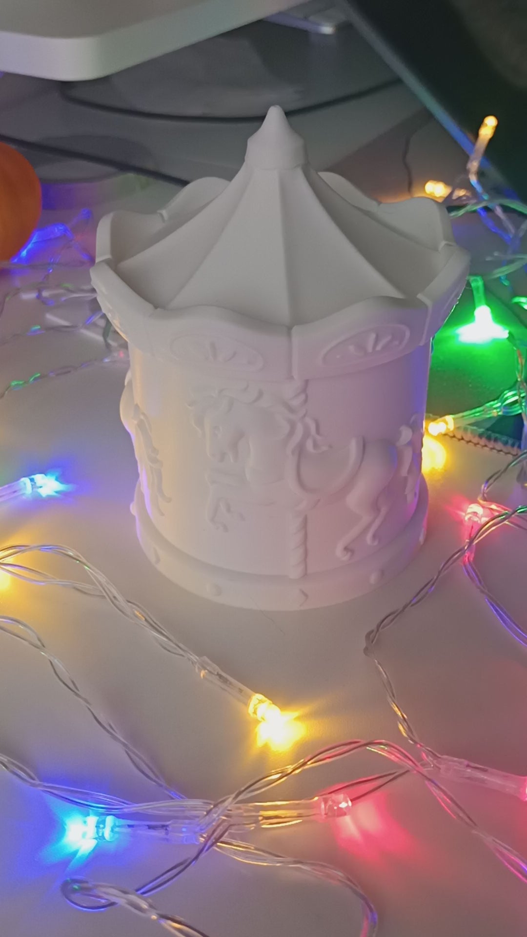 This charming Carousel Trinket Box is a small, whimsical storage piece shaped like a classic merry-go-round. Perfect for keeping jewelry, tiny treasures, or any small items you want to tuck away safely.
